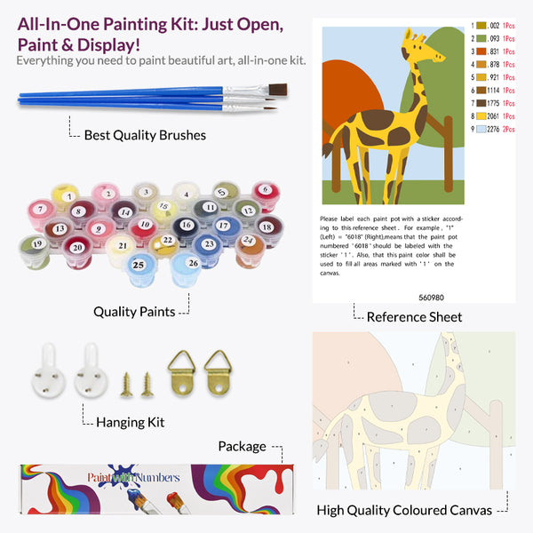 A unique combination of real image and abstraction is a true work of art. Giraffe Paint by Numbers for Kids will undoubtedly decorate your interior, and no one will guess that it is not painted by the artist.